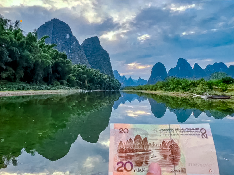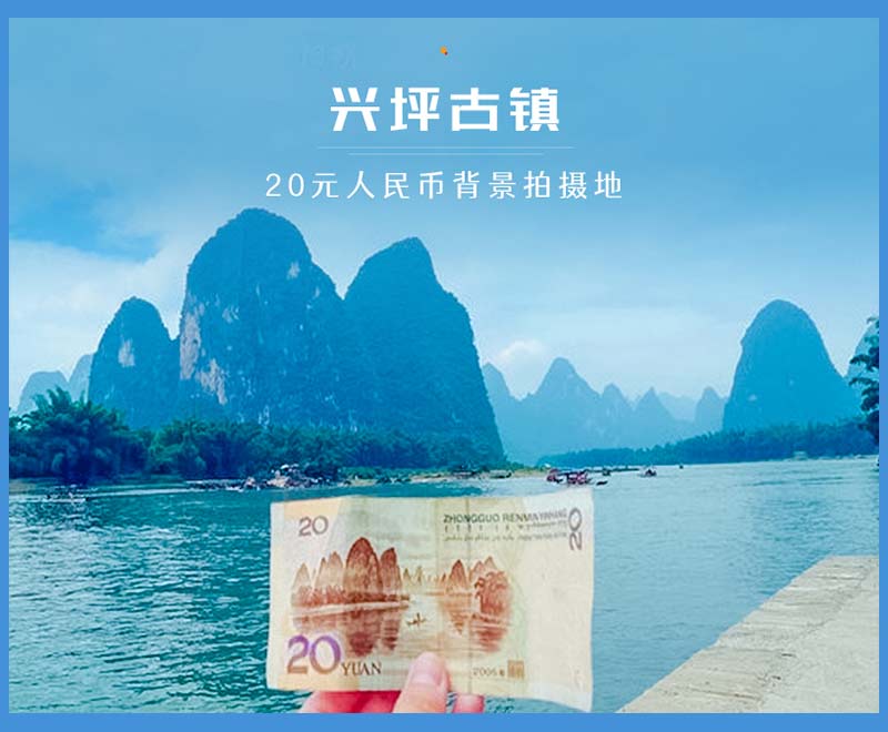 - 中午我们抵达20元人民币背景拍摄地。20元人民币背景图案拍摄地点,选取的是桂林漓江精华段兴坪古镇境内元宝山处,一个叫黄布倒影的景点,这里秀丽的山峦和清澈的漓江水相互交映,形成一幅绝美的画面,给人以一种山重水复之处突然柳暗花明的开阔感。而20元人民币的观景台,一路上有好几个,都是免费的,你可以找一个喜欢的角度拍,记得准备一张20元的纸币,拍起来更有感觉。