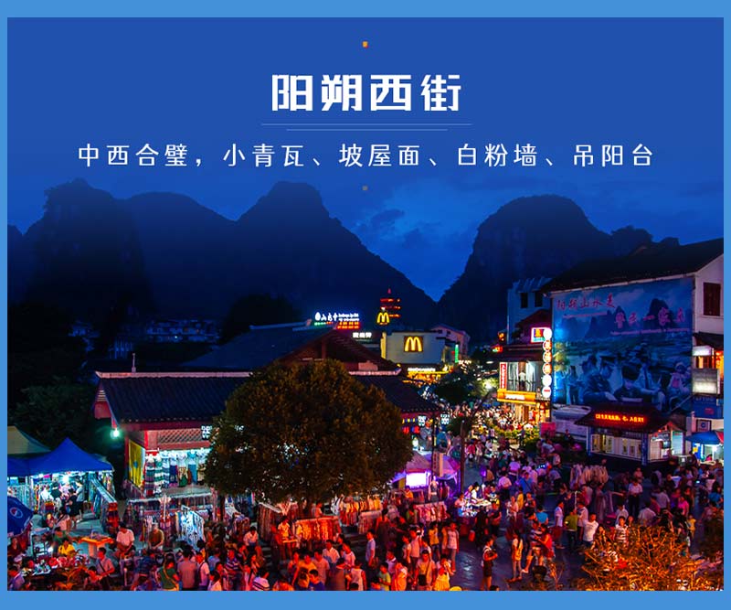 适时我们乘车前往阳朔,晚上您可自由漫步在没有国度、充满热情的“洋人街”这里外国游客居多,所以称为洋人街,桂林是国际旅游城市,来此度假的外国游客很多【阳朔西街】感受浓郁的异国风情,这边晚上的酒店非常热闹,有机会可以去体验下阳朔的夜生活文化。