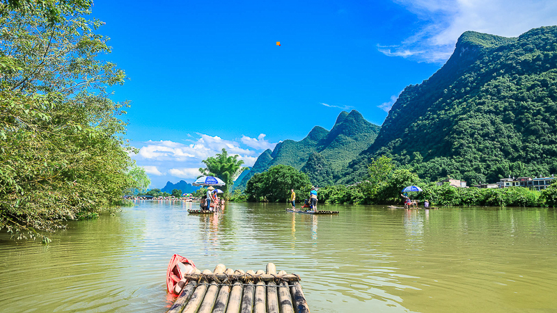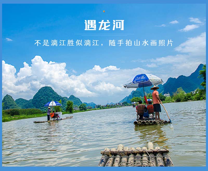 - 早餐后我们乘车前往遇龙河漂流:遇龙河两岸山峰清秀迤逦,连绵起伏,形态万千,江岸绿草如茵,翠竹葱郁,树木繁荫。遇龙河是漓江在阳朔境内最长的一条支流。感受它的美一定要来一次漂流,不同于一般漂流,遇龙河漂流是平静的漂流,漂流的主要目的不是刺激,而是躺在竹筏上的躺椅上享受宁静的河流,享受牧歌般的田园,享受时间似乎停滞了的感觉,只偶尔冲下小水坝,让你平静中也有欢笑。这里的竹筏是人工划桨,能真正地感受人在画中游,来了就要体验这种原汁原味的。