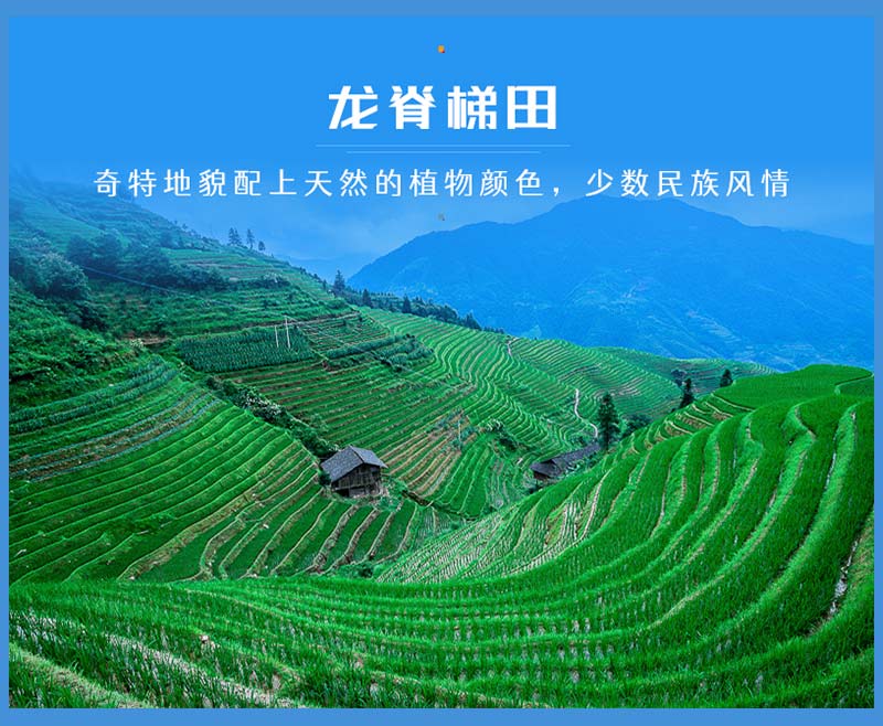 龙脊梯田位于广西龙胜各族自治县,梯田有鬼斧神工的造型和如诗如画的意境。曲线优美。其线条行云流水,潇洒柔畅;其规模磅礴壮观,气势恢弘,有“梯田世界之冠”的美誉。