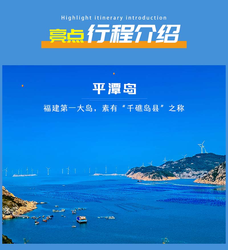 - 上午  车速40迈一路向北绝美海景欣赏:媲美台湾花莲的沿海网红公路;北部湾的沿海风景,算是平潭沿海景色的精髓!一半青山一半海湾,站在北部湾玻璃栈道上听海浪涛声、山林呼啸,看美丽海岸线、蓝天、碧海。(如遇玻璃栈道交通管制,根据实际政策更换为北部湾岚道其他观景平台);