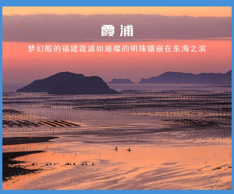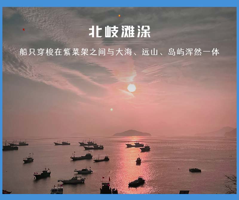 - 清晨   想看日出的朋友,自由结伴打车前往北岐滩涂拍摄海上日出,朝霞映照下的滩涂风光及渔民劳作场景,北歧是福建霞浦著名的日出点,吸引着大量的摄影爱好者,有名的是虎皮样的滩涂斑纹和满滩满海的竿影、人影和船影。涨潮时海上忙碌的船只、波光粼粼的大海和远处山影岛屿浑然一体,蔚为壮观。退潮时,海滩的纹理渐显秀质,劳作的渔民游动在虎皮滩上,使得镇滩涂更具有韵律美和动态美。