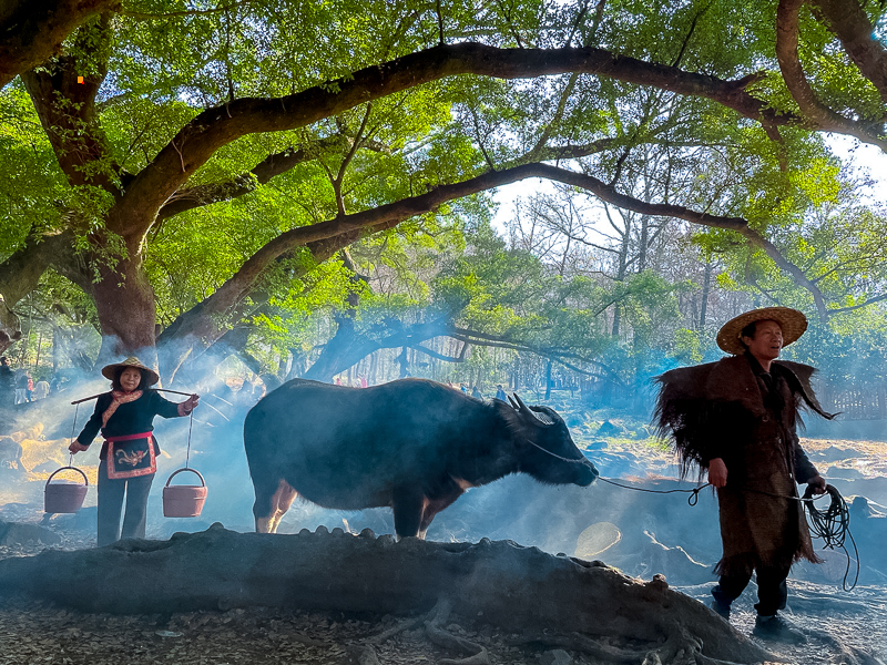 - 下午 前往杨家溪榕枫公园,古榕树虬枝伸展,遮天蔽日。古榕树下我们先安排老农牵牛拍摄:在古榕树下布置烟雾场景,阳光透过榕树间隙照射下来形成丁达尔光线,此时畲族阿婆挑担子,阿公牵牛配合拍摄;随后安排村姑赶鹅拍摄,这是杨家溪榕树下的新晋宠儿,村姑模样打扮的妇女赶着一群白鹅于榕树下觅食,憨态可掬的鹅群很是讨喜。