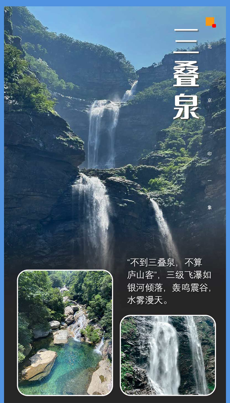三叠泉是庐山的标志性景点之一,有 “不到三叠泉,不算庐山客” 之说。它由大月山、五老峰的涧水汇合,从大月山流出,经过五老峰背,由北崖悬口注入大盘石上,又飞泻到二级大盘石,再喷洒至三级盘石,形成三叠。每叠各具特色,上级如飘雪拖练,中级如碎玉摧冰,下级如玉龙走潭,仰看与俯视各蔚为壮观。