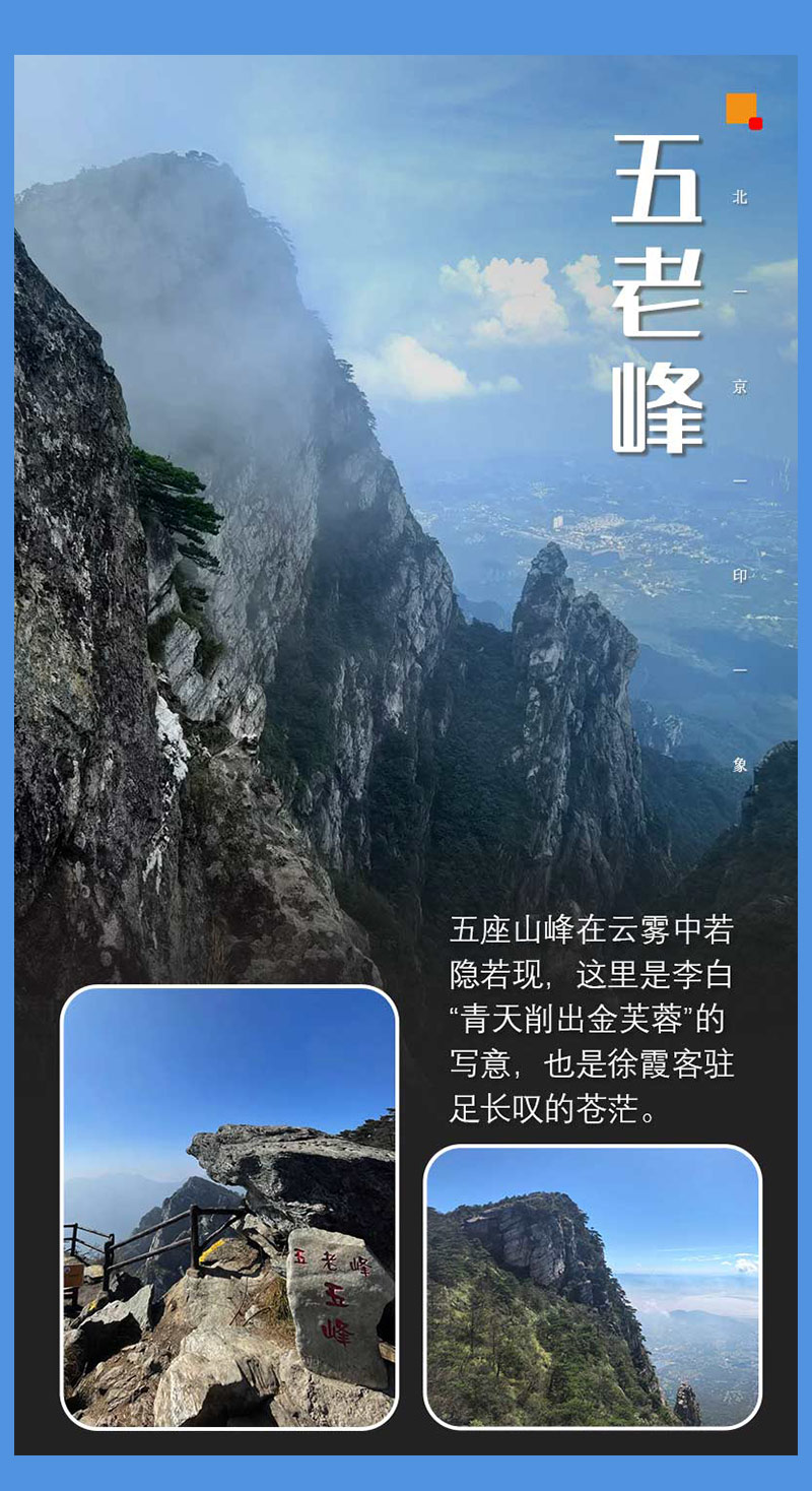 五老峰由并列的五个山峰组成,仰望俨若席地而坐的五位老翁。五个山峰各具特色,一峰到五峰景色各异,攀爬过程中可以欣赏到奇松、怪石、云海等景观。站在五老峰上,视野极为开阔,能俯瞰到鄱阳湖的浩渺烟波和周边的层峦叠嶂,让人感受到大自然的雄伟与壮观。