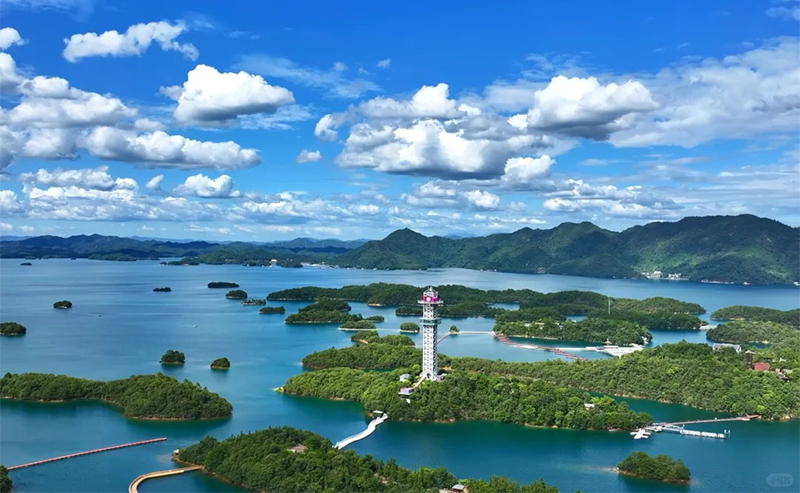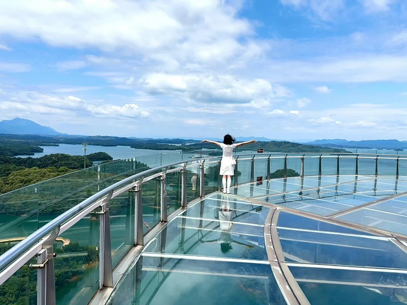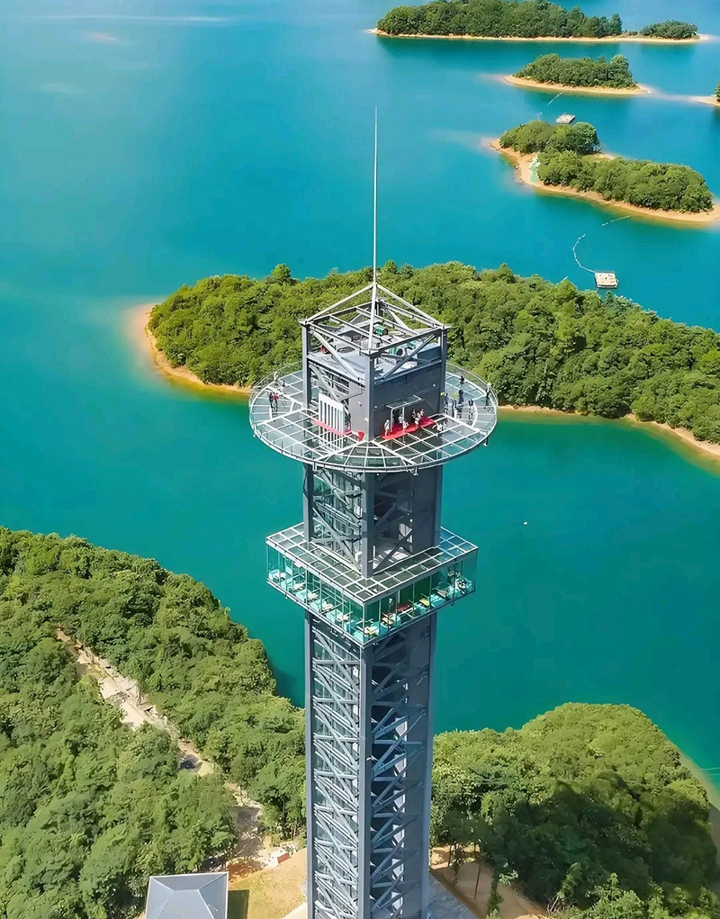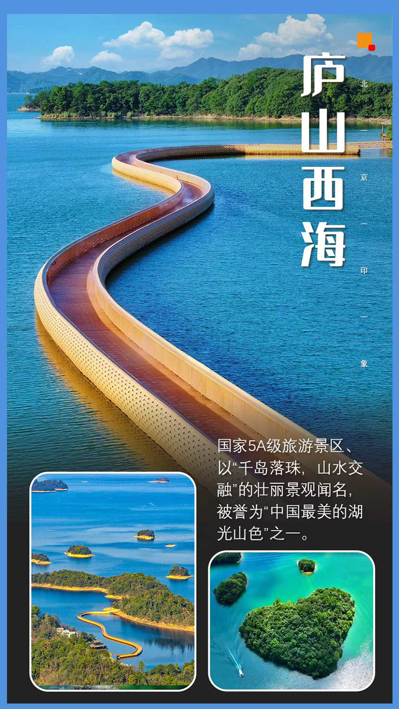 西海之星:高空观景核心。岛上的 99 米西海之星玻璃观光塔是地标,全透明的观景平台可 360° 俯瞰庐山西海数千岛屿的壮阔景观,还有归去来兮看台、护塔龙王等小景,日落时分登塔景色尤佳。