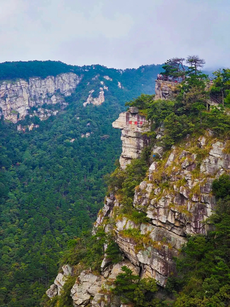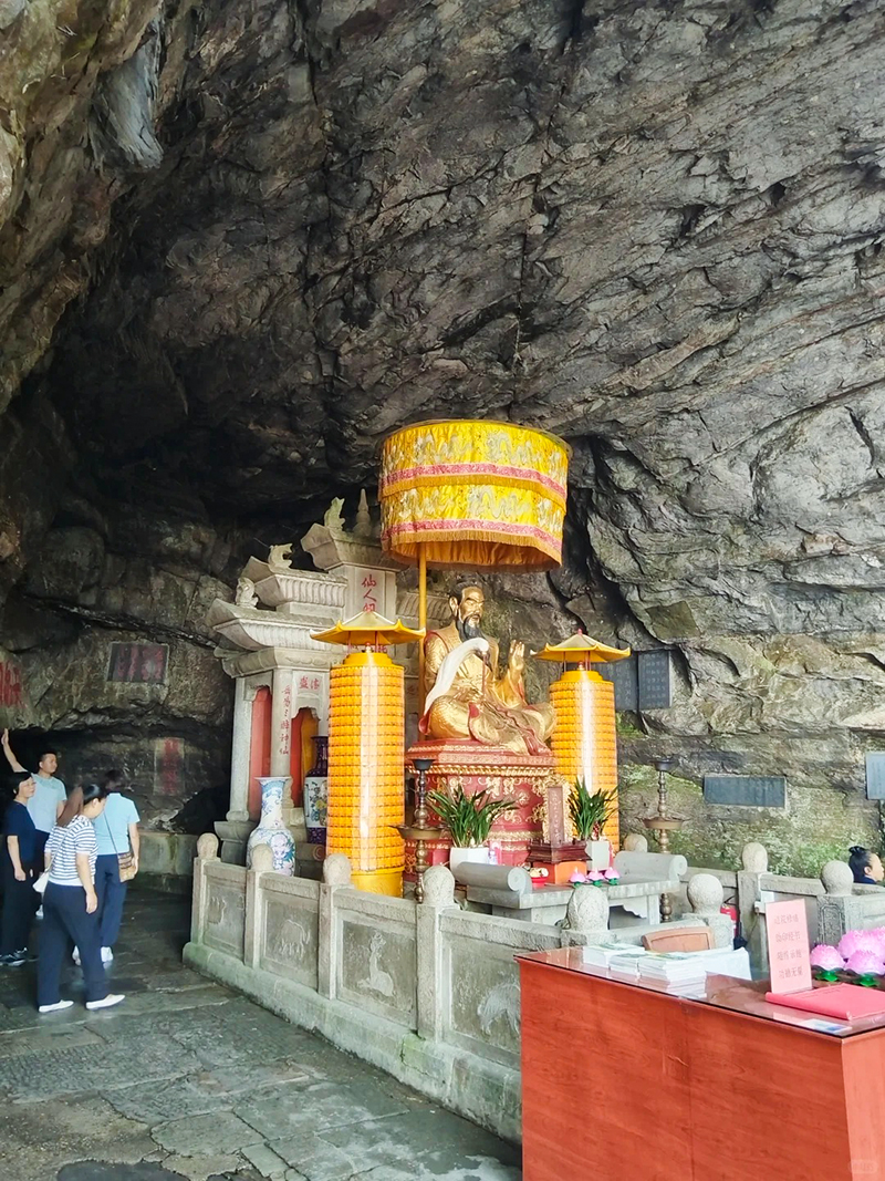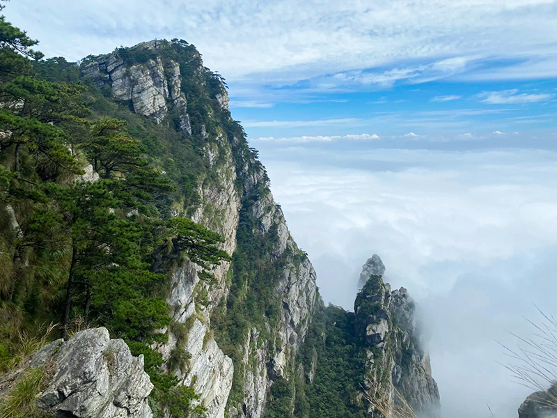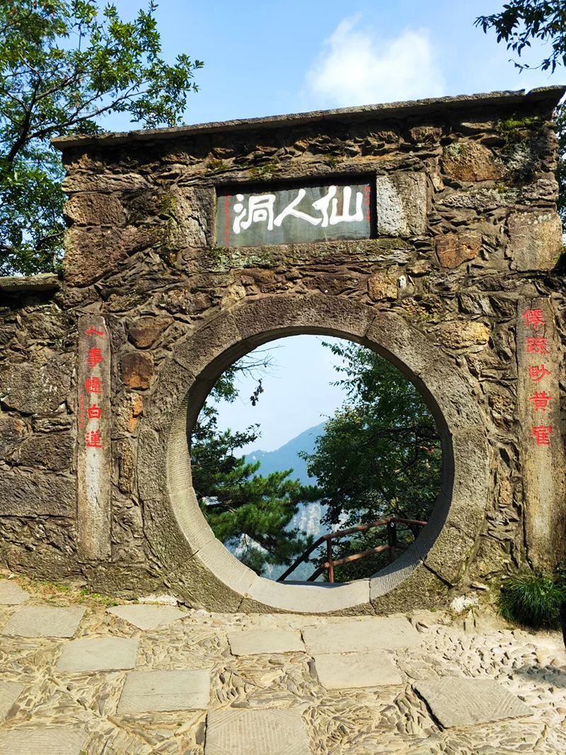 锦绣谷-仙人洞由第四纪冰川刻切形成的冰川槽谷,长约1.5公里。沿锦绣谷傍绝壁悬崖修筑的石级便道游览,可谓“路盘松顶上,穿云破雾出。走到尽头就是仙人洞,洞内现存纯阳殿、蟾蜍石、石松及“一滴泉”等景观,飞岩可栖身,清泉可洗心,俯视山外可见云海江流,摩崖石刻包括“纵览云飞”“山高水滴千秋不断”等题刻。