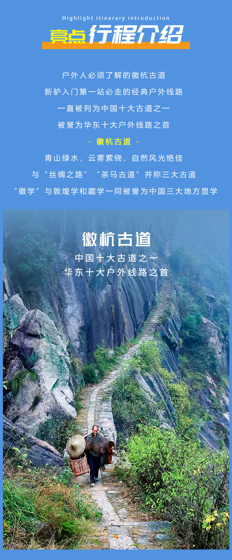 有人说,这是一条神奇的“丝绸之路”;有人说,这是一条风光绝美的风景画廊;有人说,这是记录徽商走出大山走出人生辉煌的历史诉说。它就是中国继“丝绸之路”、“茶马古道”之后的第三条著名古道,徽杭古道。