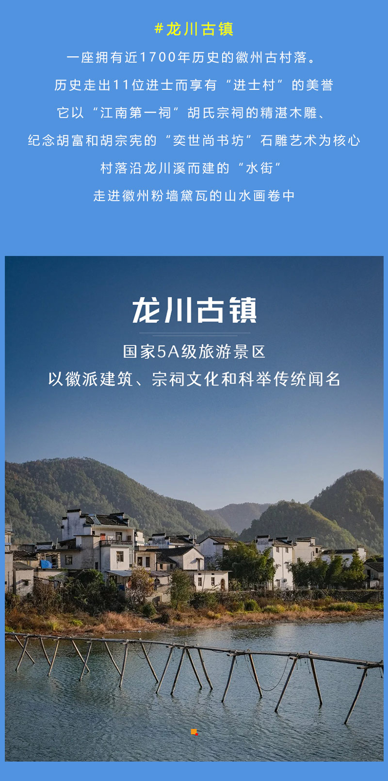 龙川旅游风景区人文景观与自然景观相结合,胡氏宗祠,为江南第一祠,素有“木雕艺术博物馆”和“民族艺术殿堂”之美称,奕世尚书坊是明代正宗石雕牌楼,为徽派石雕之最。