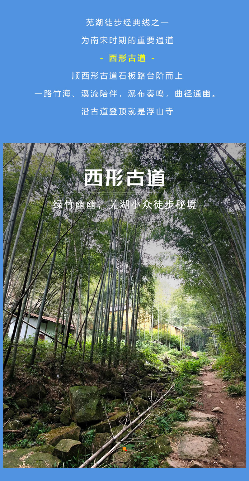 西形古道:这条古道始建于南宋时期,一条由3858级古山石铺就的千年秘径,这条古道曾是连接浮山与周边村落的重要通道。穿行竹海邂逅唐宋观音庵,听溪石锃亮如铜器,山腰处的小桥流水,山顶的浮山寺香火缭绕,都为徒步者带来了一场视觉与心灵的盛宴!