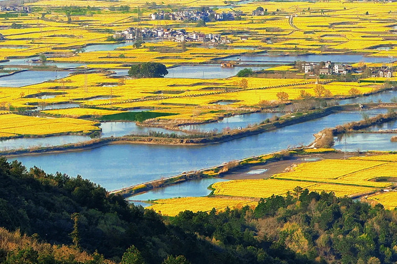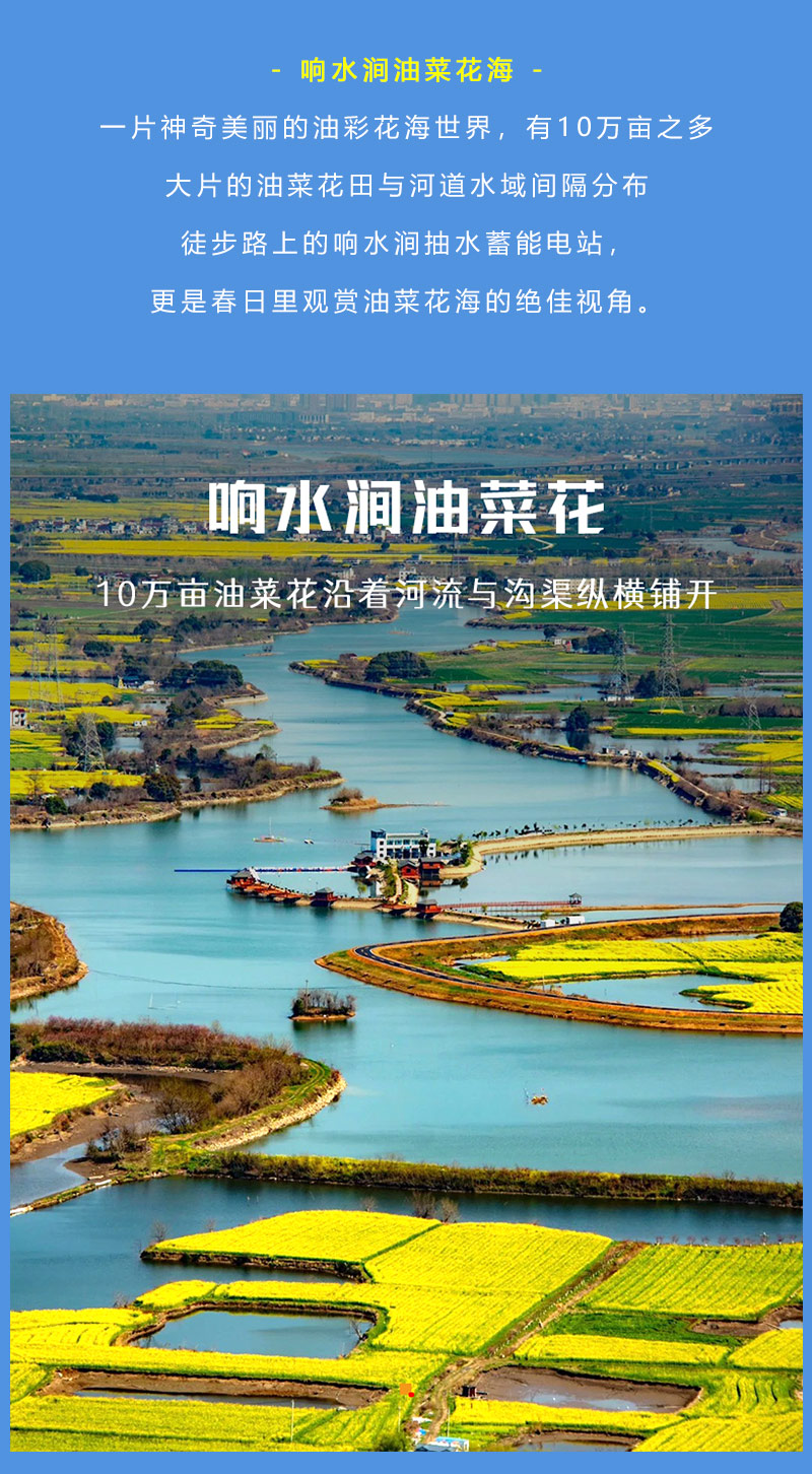 响水涧油菜花海:一片神奇美丽的油彩花海世界,有10万亩之多,在这里我们将看到大片的油菜花田与河道水域间隔分布。徒步路上的响水涧抽水蓄能电站,更是春日里观赏油菜花海的绝佳视角。