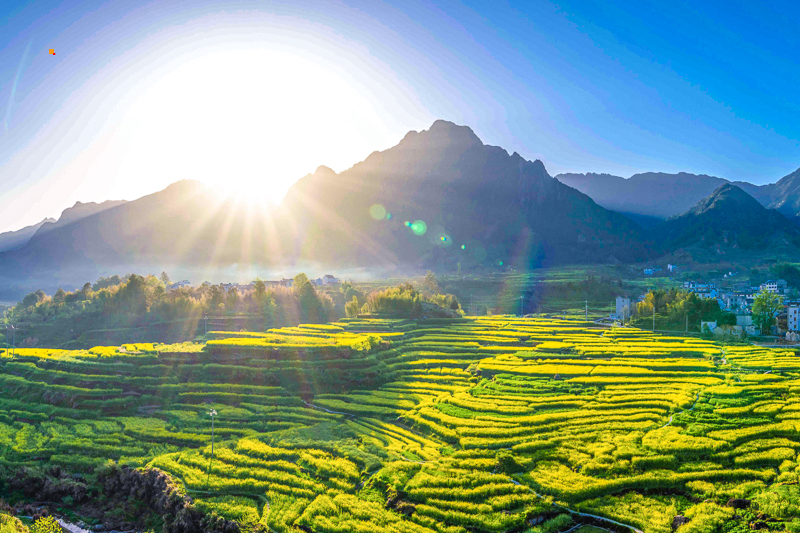 随意找条田埂小道,穿过梯田往山上去。踏上松软又结实的土壤,整个人瞬间放松下来,这是大自然特有的亲切。一层层的梯田从山脚盘绕至山顶,错落有致,蔚为壮观。金灿灿的油菜花绵延几十里,只要风起,油菜花田就化身成蜜的海洋,一道道金色的“闪电”在花海中炸开,深深吸一口花香,好像快醉倒在春风里。