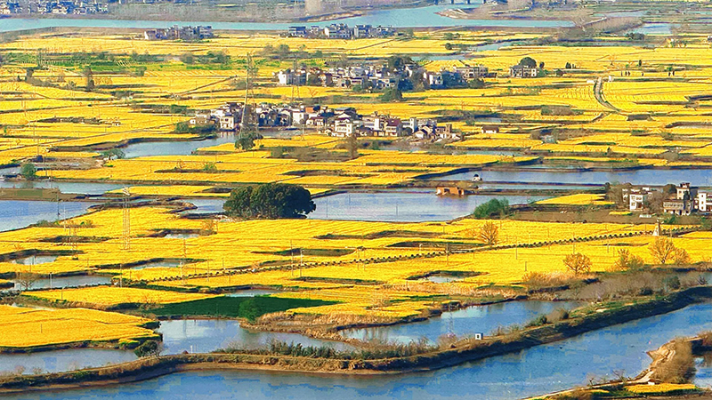 三月的家朋乡,绵延数十公里都是油菜花的世界,大大小小的油菜花梯田似曲池、似新月,高低错落,阡陌相连。