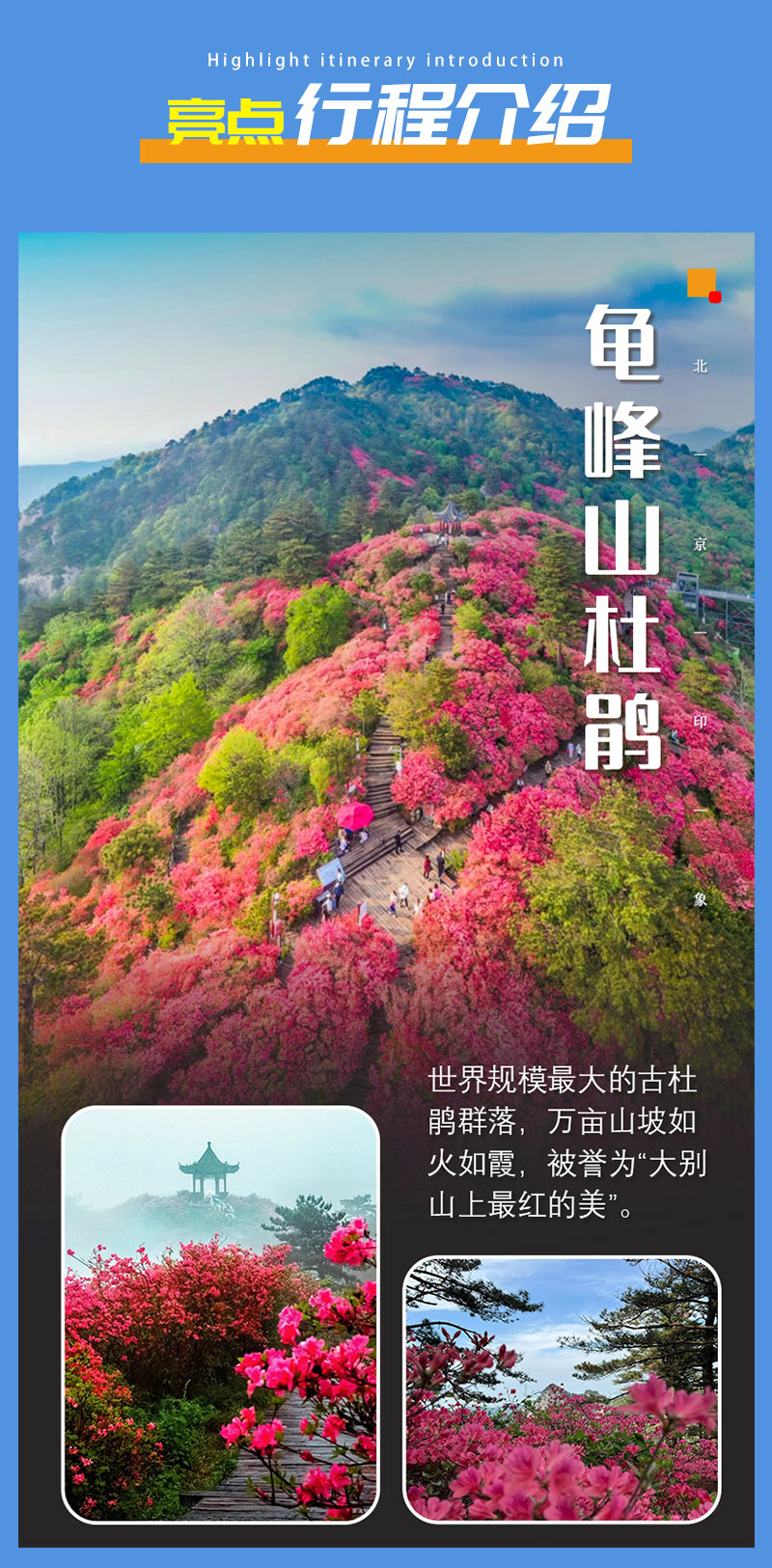 - 请按集合信息准时集合出发,直奔“中国面积最大古杜鹃群”的【龟峰山杜鹃】游览。那句“人间四月天,麻城看杜鹃”,便是指的这里了。这里拥有10万亩原生态古杜鹃群落,堪称华中一绝,也是迄今发现的我国较大的古杜鹃原始群落,面积之大、年代之久、密度之高、景色之美、保存之好,在华中地区堪称绝,在全国也属罕见。龟峰山的杜鹃平均树龄在100年以上哦!