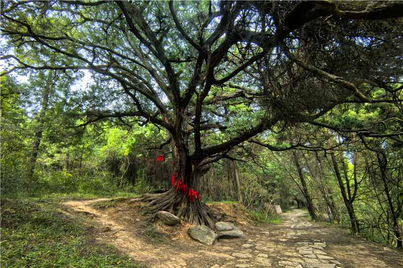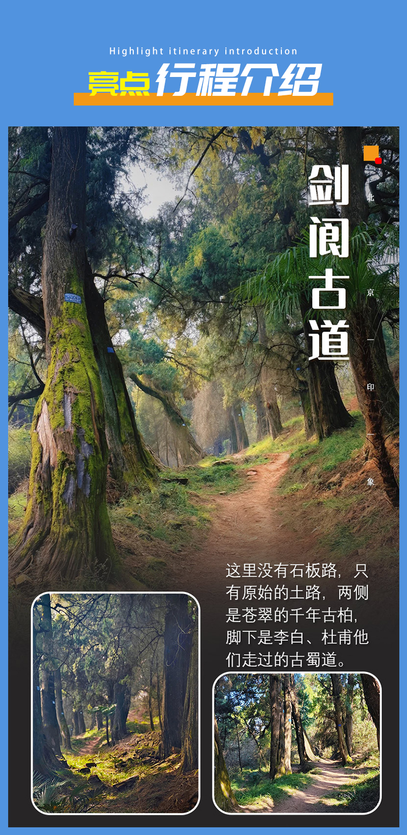 这一段是古蜀道中保存较完整的精华段落,以千年古柏、青石板路和深厚历史底蕴著称。沿途两排千年古柏(皇柏)遮天蔽日,树龄多在千年以上,有 2300 年的罗汉柏、九龙柏等珍稀古木,是全球规模最大、年代最久的人工行道树群。另有抄手铺、汉源桥、李商隐吟诗处等古迹;《春潮急》《李冰》等电影曾在此取景。
