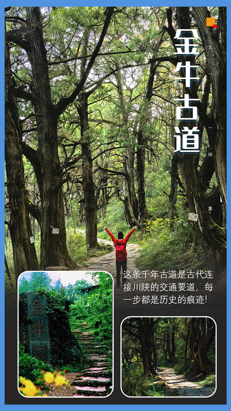 线路轻松简单。走在被古人磨平的青石板上,沿途有几百多株千年古柏,最早可以追溯到秦惠王时期,可能需要十来人才能合抱,金牛古道是古人往来川北陕南的必经之路,历史非常悠久,号称“帝国国家公路”。