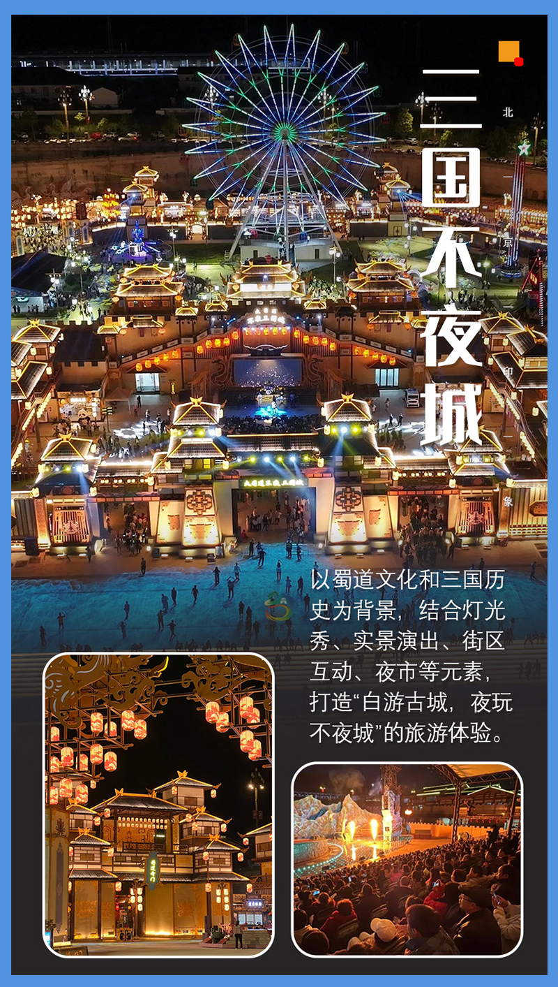 - 傍晚集合前往剑阁安排入住。之后前往【大蜀道不夜三国城】欣赏醉美夜景,观看精彩演出,品尝美食!