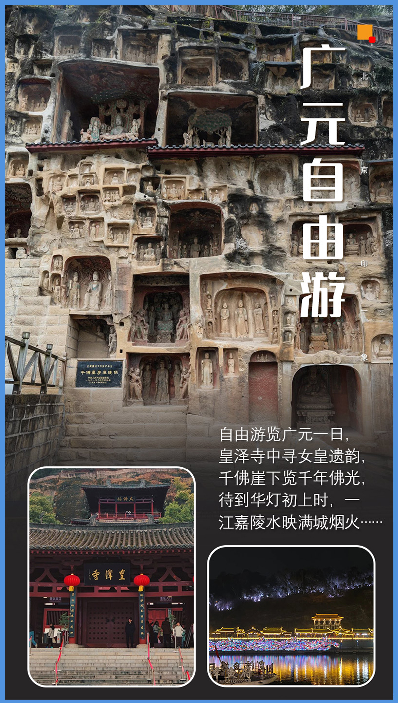 - 全天指定酒店安排入住。之后可自由结伴游览广元:【皇泽寺】、【千佛崖等地】。晚上可前往嘉陵江边、凤凰楼欣赏醉美夜景,图腾夜市品尝美食!
