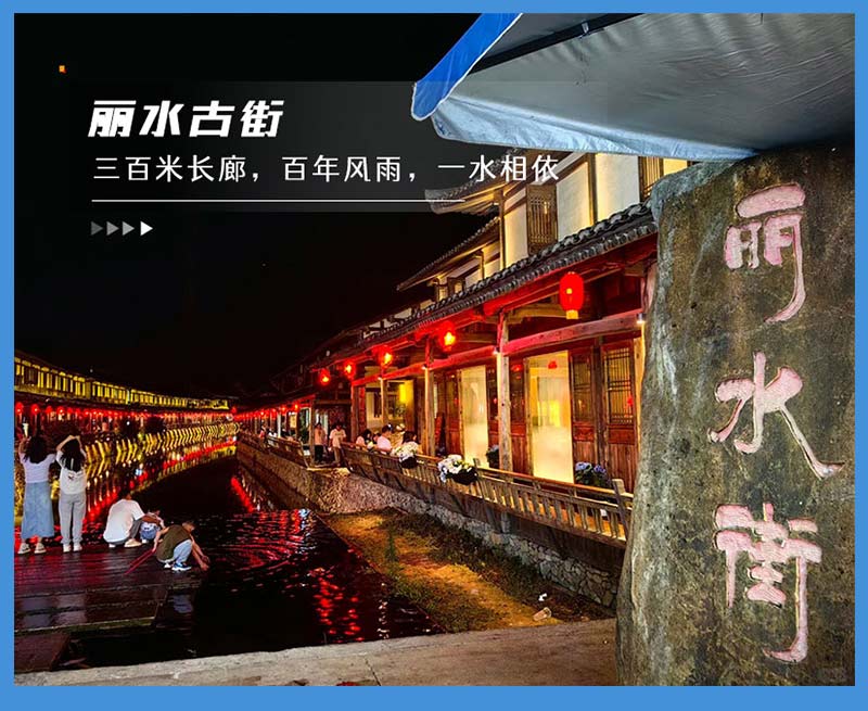 - 天黑之后我们前往丽水古街,旧时90余间店面长廊相连,长廊依水而建, 随水势蜿蜒,廊下挂着一个个红灯笼,和参天的古树绿影相向。沿街有丽水古桥、接官花亭、楠溪石寨等景观,非常值得一逛。- 适时前往安排住宿,大家晚上自由结伴寻觅当地美食。