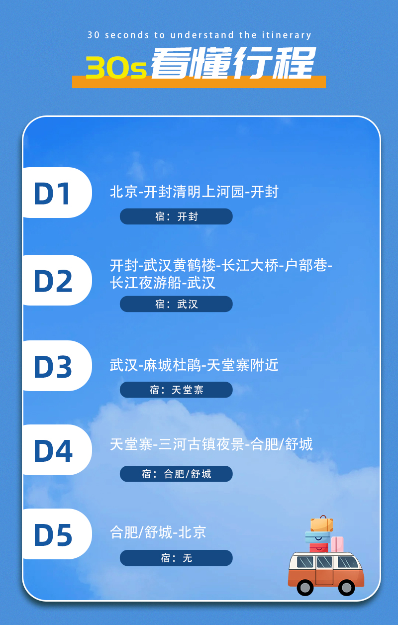 2) 门票:龟峰山+景交车130元,天堂寨+观光车100元,清明上河园120元(不含东京梦华演出,需自行预约第一场),黄鹤楼70元,长江夜游船自愿选择;以上价格仅供参考,以景区实际规定为准;