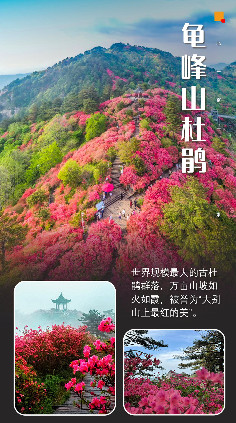 “闲折两枝持在手,细看不似人间有。花中此物似西施,芙蓉芍药皆嫫母。”这是唐代白居易吟咏杜鹃花的诗句,将之比作西施,可见其美。在全国各地,可赏杜鹃花(又名映山红)的地方不少,不过有一处地方,尚养在深闺少人识,那就是拥有被上海大世界基尼斯纪录大全命名为“中国面积最大古杜鹃群”的麻城。龟峰山风景区位于大别山中段,距麻城市21公里。龟峰山全长16公里,最高峰海拔1320米,区内山势险峻,云雾缭绕,有如仙境。因其地形山势酷似一只昂首吞日的神龟而得名“龟山”,是大别山中的名山。