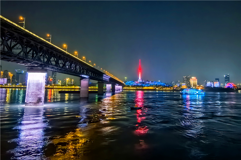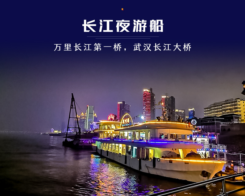- 你也可以选择【长江夜游船】长江是游客来到武汉不可或缺的一站。乘坐游船行驶于江面上,可以将长江大桥、江滩、黄鹤楼等两岸风光尽收眼底,夜游景色更佳。船上还提供中餐、西餐、自助餐等服务。