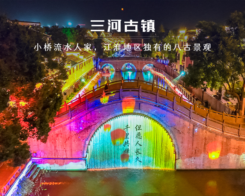 三河古镇是一座典型的水乡古镇,因丰乐河、杭埠河、小南河三水交汇而得名。古镇内荟萃了丰富的人文景观,具有典型的“小桥流水人家,水乡古镇特色”。集合了古河、古桥、古圩、古街巷、古茶楼、古民居、古庙台、古战场,江淮地区独有的八古景观。这里远在春秋战国时期便已初具雏形,素有“游在黄山,食在三河”之誉。