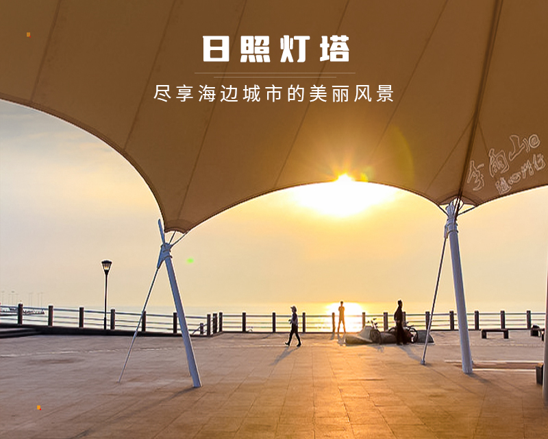 日照灯塔由灯塔广场、观石广场、观涛广场组成。 沿海地段以灯塔、自然礁石群为主题,整合了护岸、木栈道、硬质铺装等带状景观,并将大面积的绿化和水、石、亭等点状、带状景观有机组合,加之夜晚繁星般的灯火和白色张拉膜的映衬,使此地无不显示日月同辉的景观。