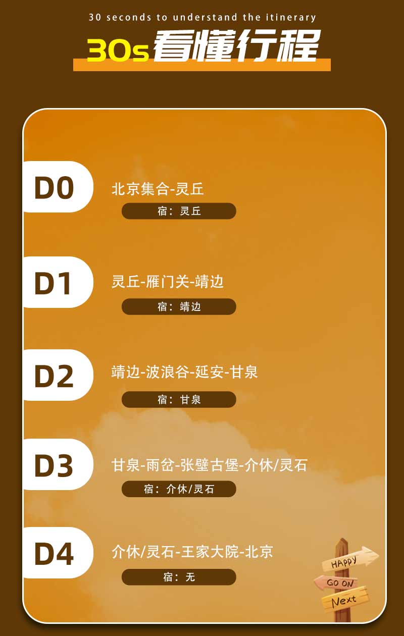 - 根据集合通知要求准时集合出发,领队会在车上详细给大家介绍未来几天的行程和注意事项,大家在车上相互认识,请自备些路餐,当晚在灵丘附近入住;