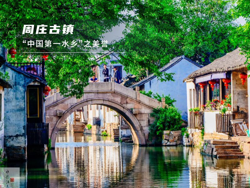 周庄古镇,周庄是一座江南小镇,有“中国第一水乡”之美誉。沈厅、张厅、迷楼、叶楚伧故居、澄虚道院、全福寺等名胜古迹,具有很高的历史价值和观赏性。古桥居多,且桥桥相望,桥桥相连,至今仍保存着建自元、明、清代的石桥。坐在船上游览,穿桥过洞,颇有情趣。周庄古镇四面环水,因河成镇,依水成街,以街为市。主要景点有富安桥、双桥、沈厅等。井字型河道上完好保存着14座建于元、明、清各代的古石桥。800多户原住民枕河而居,60%以上的民居依旧保存着明清时期的建筑风貌。