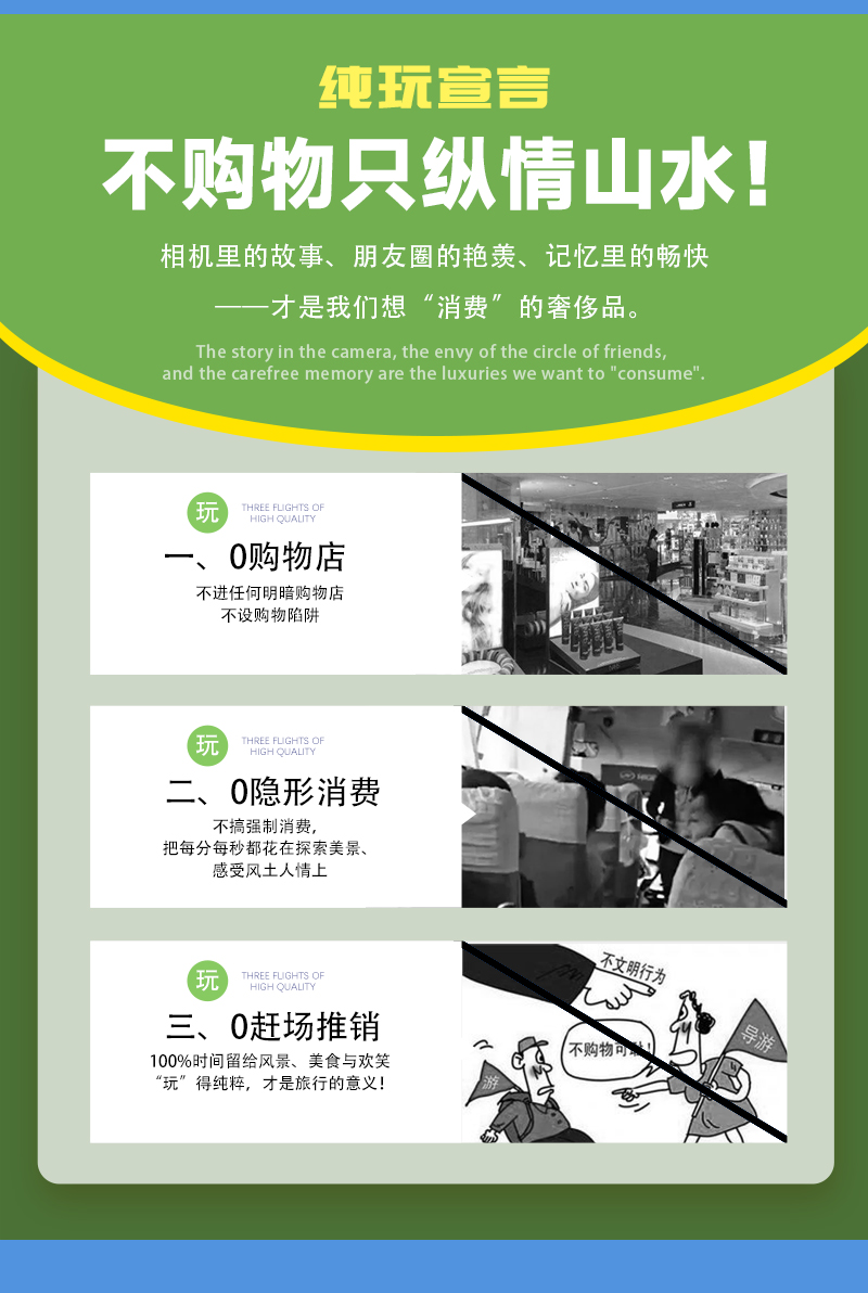 1)本活动属于户外旅行活动,纯玩,全程不进购物店,没有任何形式购物环节,领队也不作购物推荐,敬请谅解;同时本活动所有费用已明示(包括有可能您自愿自费的项目),无其它任何收费,请您仔细阅读费用包含和费用不含内容。