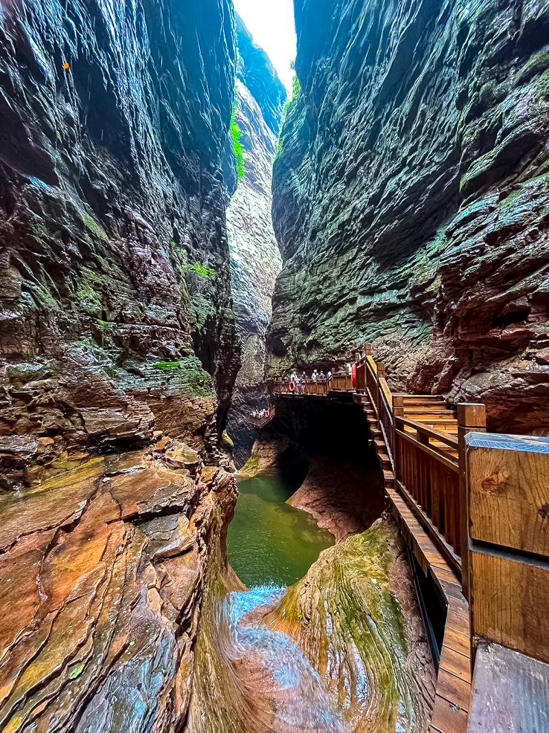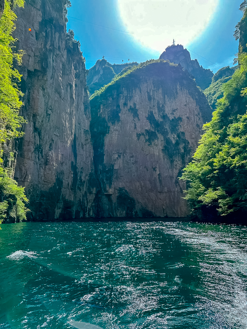 我们乘坐观光车-游船码头-峡谷爱心步行2公里-索道下站--索道山顶-玉皇宫-可坐空中巴士到达天空之城-天空之城电梯到达山底,全程需要5-6小时。有以下看点:1八泉峡的水色彩多变,下船至索道一处一景,水的深浅与光影的强弱都会影响水的色彩,非常漂亮;2爱心山谷是属于八泉峡特有的浪漫;3乘坐索道,欣赏山的壮美与辽阔,最美的山景尽收眼底。