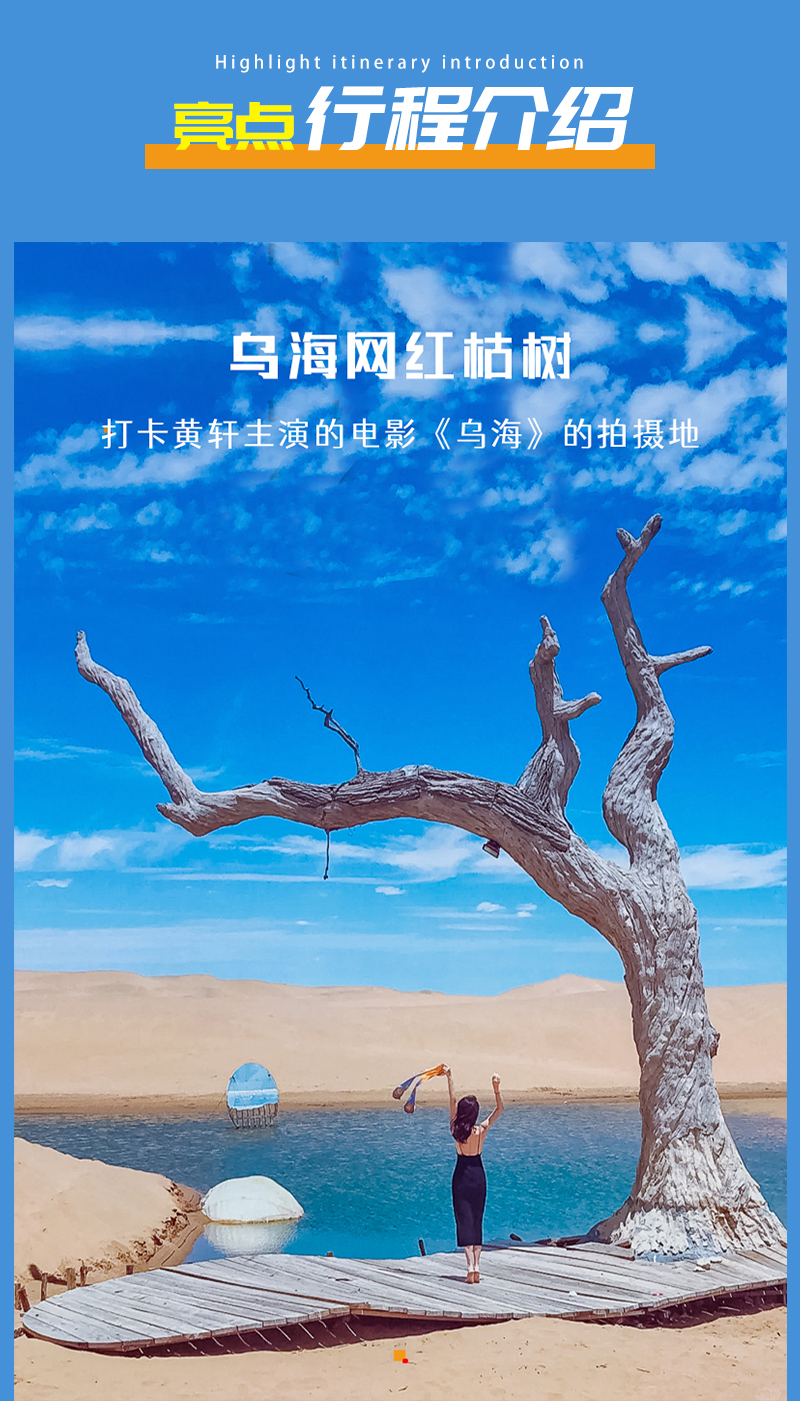 *注:由于近期乌海湖水位下降,游船可能无法运行,如游船不运行则更改为陆路交通前往网红枯树、沙漠、公路打卡!