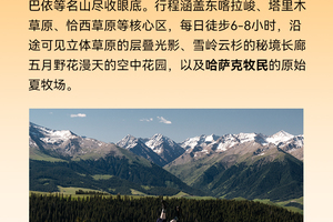 行程概览:早餐后酒店大厅集合出发,我们乘车前往著名的八卦城--特克斯县,县城以中心八卦文化广场为太极“阴阳”两仪,按八卦方位以相等距离、相同角度如射线般向外伸出“乾”、“兑”“震”、“巽“坎”、“良”、“坤”八条主街,它是现今世界上惟一一座保存良好、卦爻完整、规模最大的八卦城。八卦城是本次行程最后一个大的补给点,游览午餐后我们乘车前往喀拉峻景区门口换乘观光车徒步前往西喀拉峻草原,这也是电影《鲜花》的拍摄地, 可以在这里看到蓝的天、白的云、白云下面是银色的雪山、墨绿的杉林、淡青色的草原和五颜六色的花海,几种色彩层次分明,色调和谐,形成一幅天然图画。如果换一种说法,也可以说成:蓝天白云下是雪山,雪山云杉林下是琼库什台,琼库什台下就是喀拉峻。