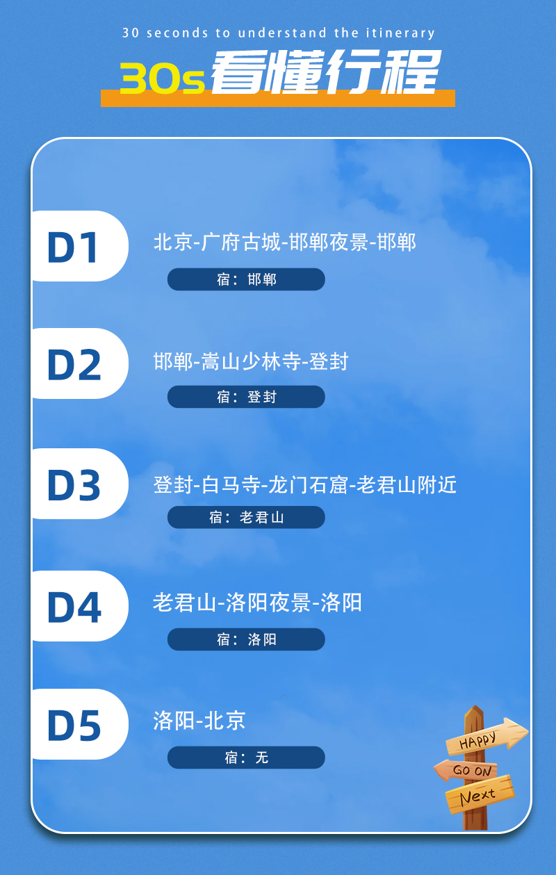 2)门票:龙门石窟90元(需自行预约5.3日下午时间段门票),老君山门票+中灵往返索道团体220元,少林寺100元(需预约5.2日门票),白马寺35元(需预约5.3上午时间段门票);价格供参考,以景区实际政策为准。