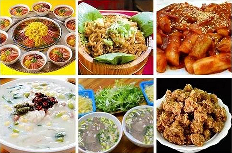 牛肉汤、胡bai辣汤、凉皮、烤面筋、白吉馍、羊肉汤、水煎包、炒凉粉、锅贴、油璇、连汤肉片等。