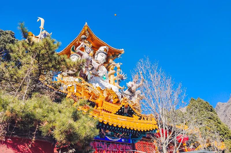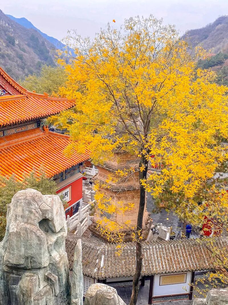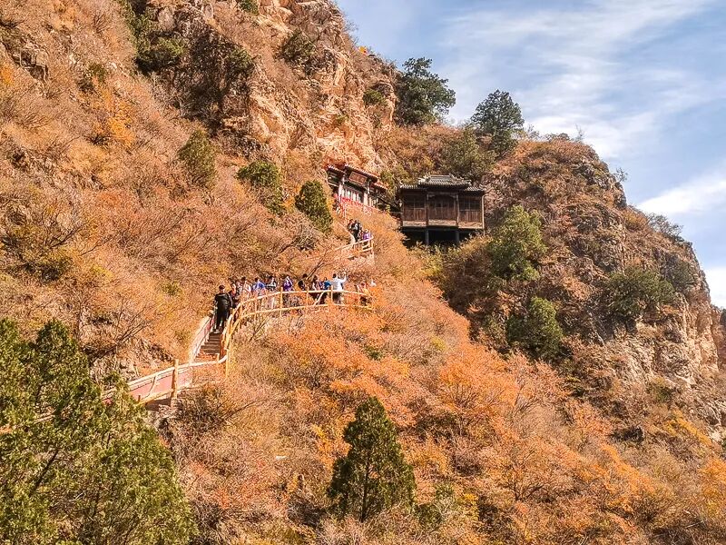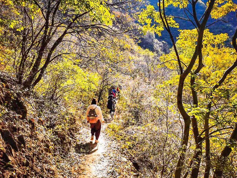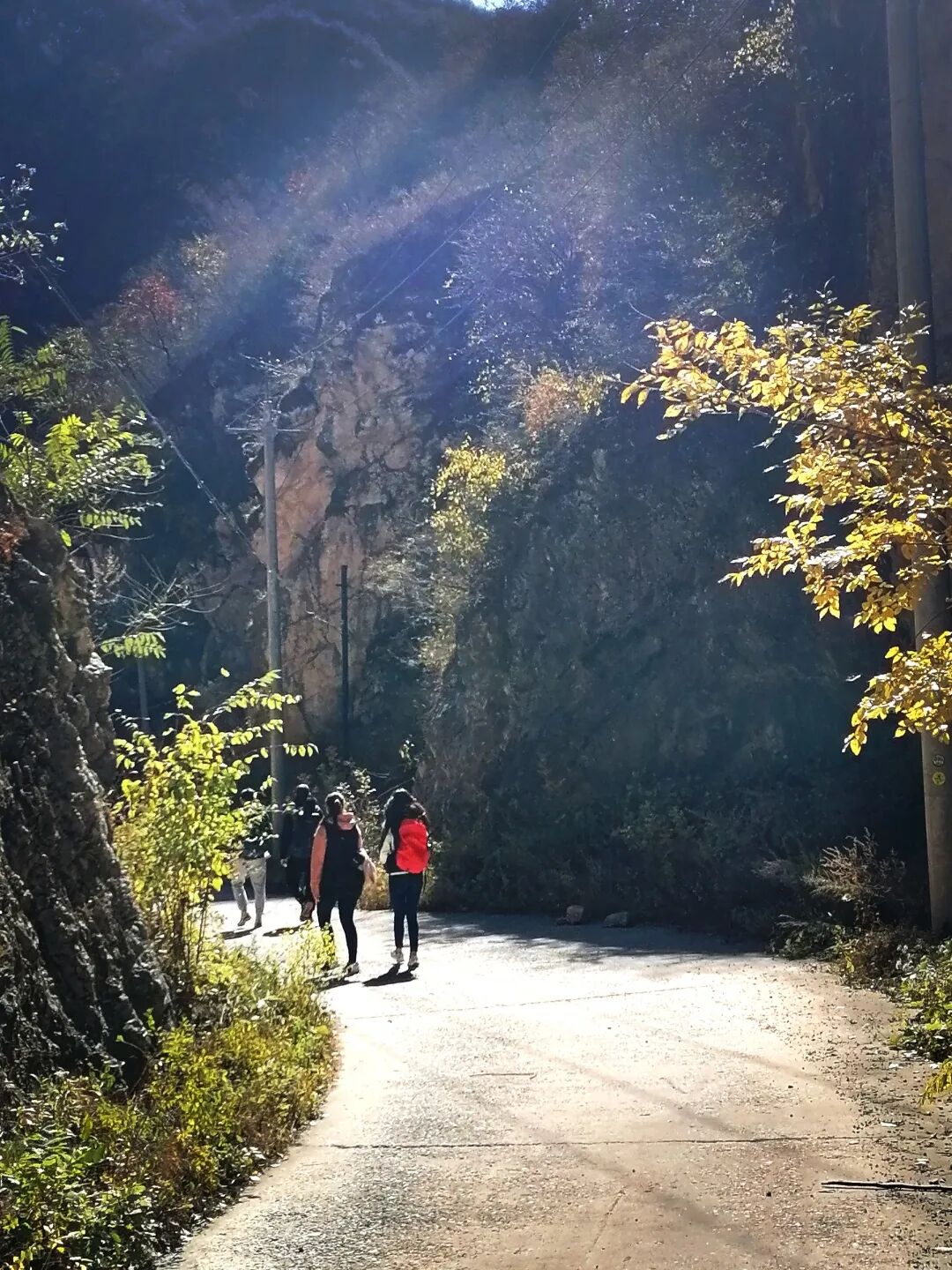 小路延山谷缓缓攀升,先经过一片树林,之后翻过一个小垭口,后面的路程就大都是平缓略有下降的山路,蜿蜒曲折穿行在山谷之中,远远便能看见白瀑寺,游览白瀑寺后,我们前往终点集合。