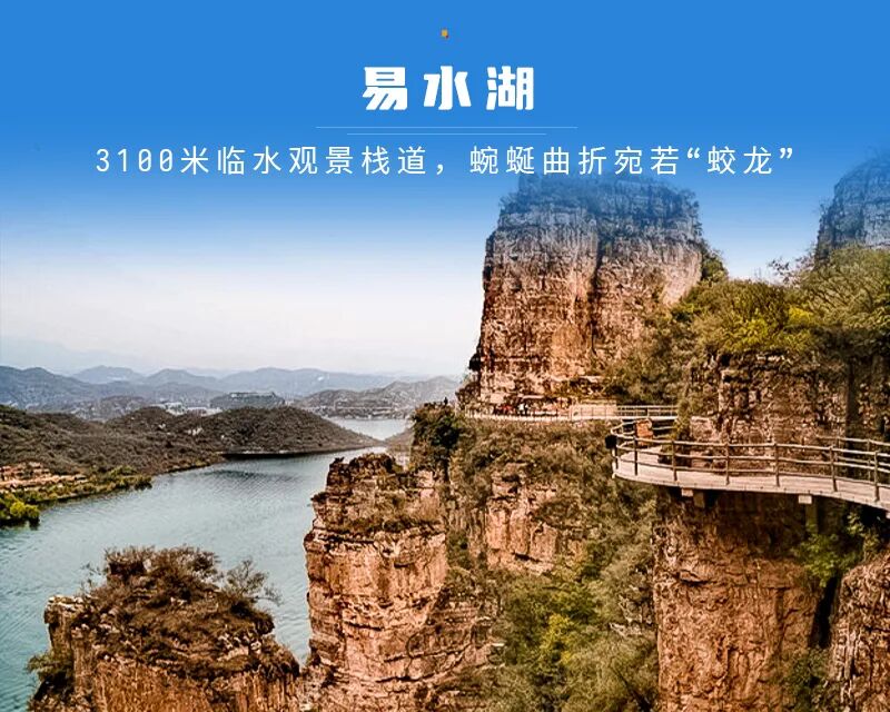 易水湖现为国家4A级景区,总规划占地约108平方公里,水域面积27平方公里,依托绝佳的山水自然资源,已经建设有易水文化休闲度假小镇、养生岛康养小镇、老子峰3100米临水栈道、高端度假湖景酒店、水上运动等业态项目。