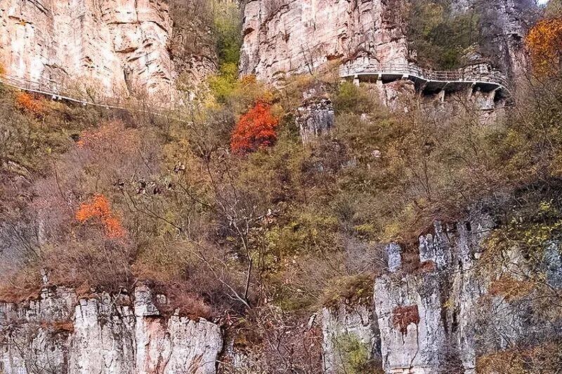 栈道分上下两层,可循环游览,蜿蜒的小路背山依水,翠绿的植被勾勒出仙境般的画面。