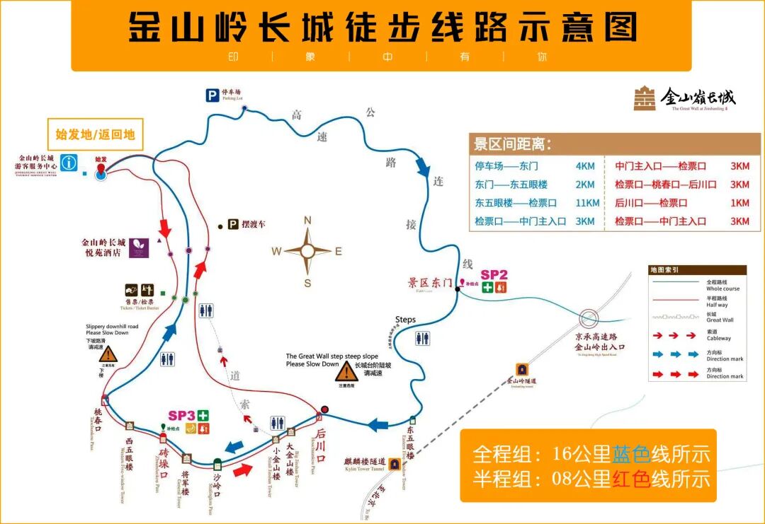 行程路线:金山岭长城中心入口→景区检票口→桃春口→砖垛口→沙岭口→小金山(此段可坐索道费用自理)→后川口→景区检票口→金山岭长城游客中心大厅