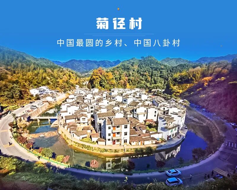菊径村始建于宋代初期,整个村庄布局独特,文化底蕴深厚,是个典型的山环水绕型村庄,四周高山环绕,一条小溪环绕整个村庄,符合中国的八卦“后山前水”设计,被誉为“中国最圆的村庄”,犹如世外桃源。