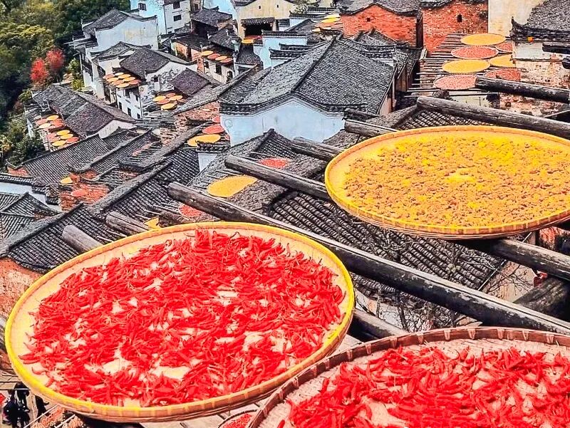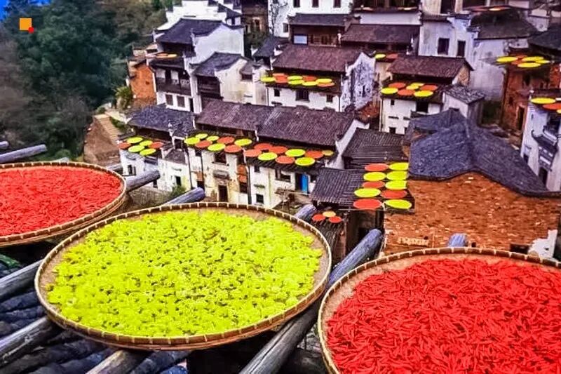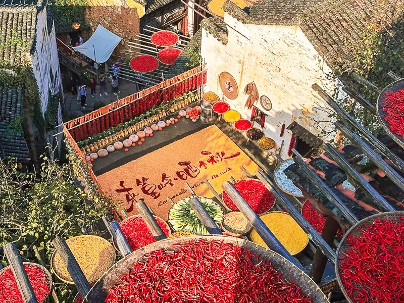 【篁岭晒秋】 挂在山崖上的篁岭古村,“地无三尺平”,数百栋徽派民居在百米落差的坡面错落排布,每当日出山头,晨曦映照,整个山间房屋晒架上五彩缤纷的丰收果实,绘就出美丽的“晒秋”农俗景观。春晒茶叶、夏晒山蕨、秋晒果蔬、冬晒乡俗……一年四季延绵有续。“晒秋”是篁岭古村500年来延续至今的晒谷物特色民俗景象。它反映了以篁岭为代表的山居民众原生态的晒物农俗,是劳动人民对丰收喜庆和未来生活所赋予的质朴美好的期待,并逐渐沉积为一种民俗和文化。