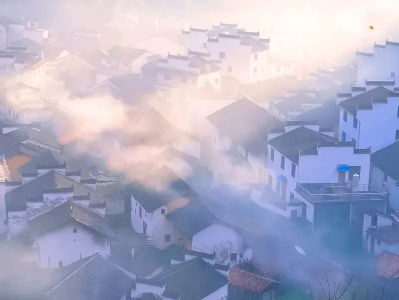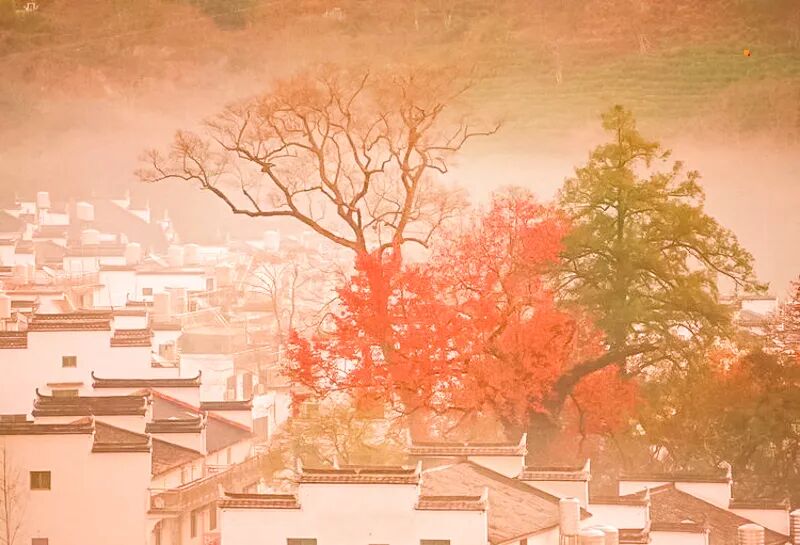 【石城晨雾】 石城是婺源看秋色比较有名气的地方,源于的村落和红叶景观。灰白的民居与枫林交相辉映,形成了秋季婺源乡村别样的风光。几百株香枫树顶上的枫叶,由浅到深的颜色变换。形成了,层林尽染的美景。清晨雾气或炊烟中的火红枫树简直就美得不像人间植物了。