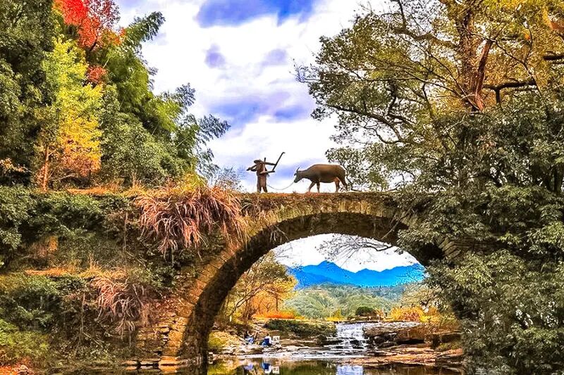 察关村迄今一千二百余年;是巴金先生的好友詹剑峰先生故里。这里背靠青山,山下清晰的溪河,溪河上有一座古桥,古桥上老汉放牛成为当地特色的人文景观。很多摄影爱好者都要到此地拍摄:老人身披蓑衣,头戴草帽牵牛过河的经典场面!到时候我们也会给大家安排一场,大家可以尽情拍摄!