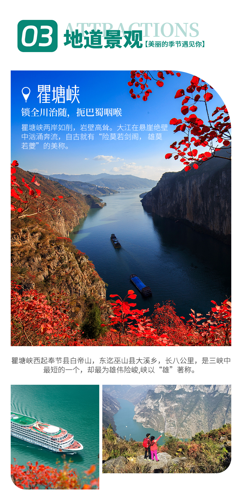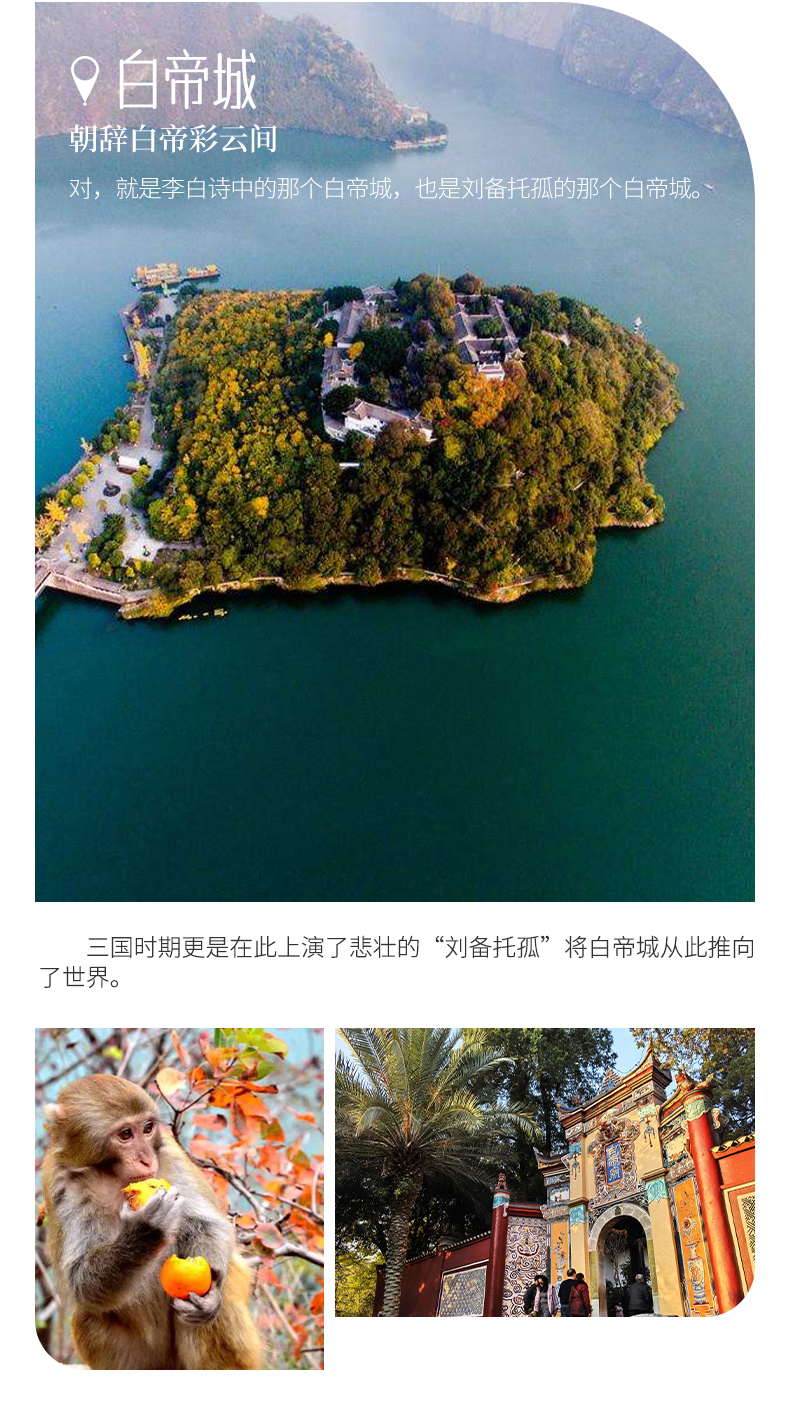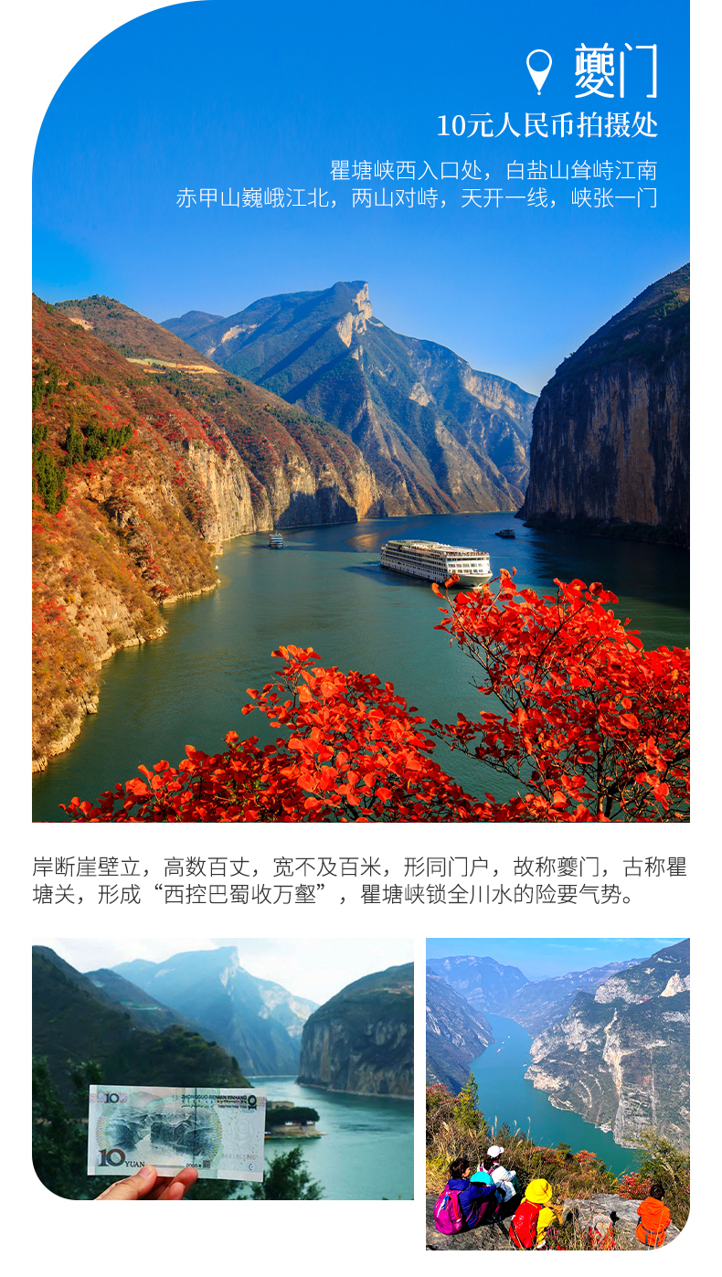 下午我们将到达白帝城瞿塘峡。瞿塘峡如今已是高峡平湖,既有满山红叶似彩霞的绚丽多姿,又有碧水荡漾、烟波浩渺的静美壮阔。来到白帝城感受一下古诗词的文化魅力,了解白帝城托孤的典故,欣赏夔门红叶,打卡10元人民币背景。