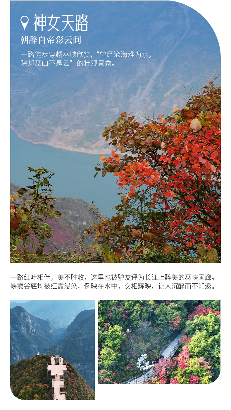 神女天路是一段风景绝佳的红叶路线,在如火如荼的红叶里穿梭,近距离接触红叶。一路穿越巫峡,欣赏“曾经沧海难为水,除却巫山不是云”的壮观景象,一路红叶相伴,美不胜收,这里也被驴友评为长江上最美的三峡画廊。