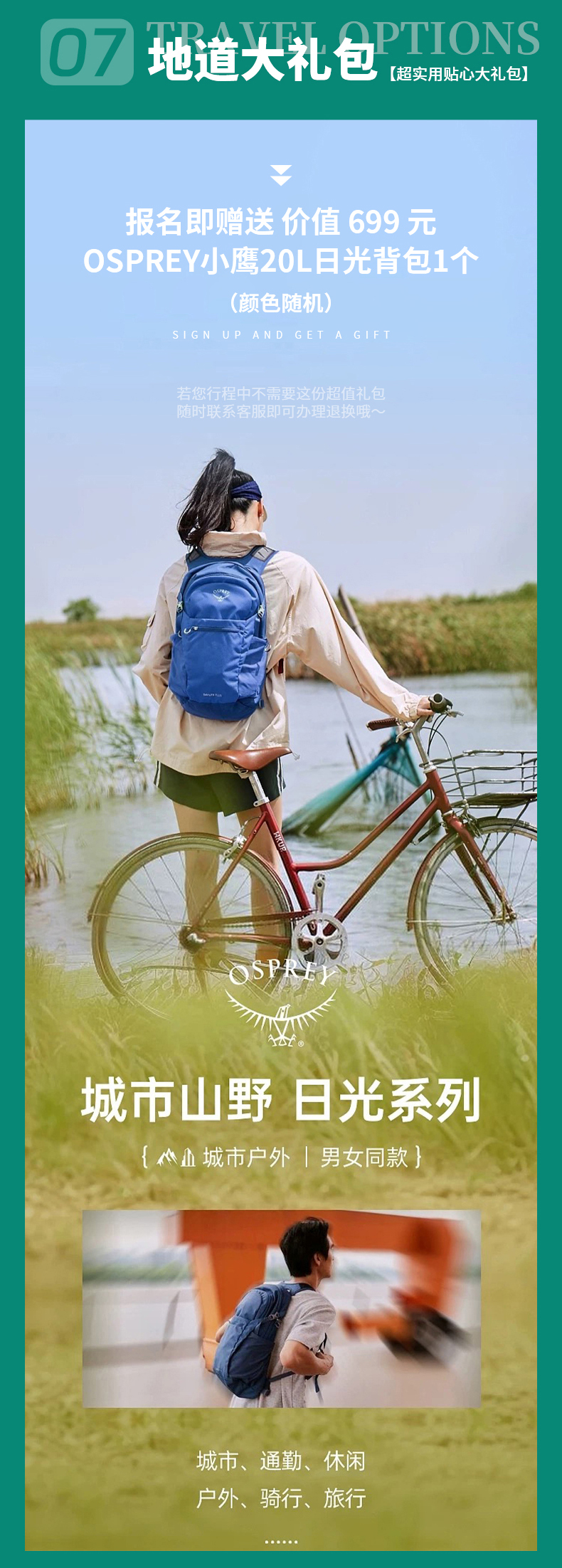 7.【赠送】价值699元 Osprey Daylite Plus 小鹰日光20L通勤背包1个(颜色随机)如需升级可加400元更换价值1299元 OSPREY HIKELITE 小鹰骇客 18L户外背包(颜色随机)