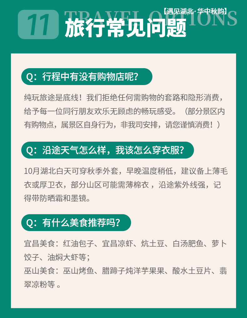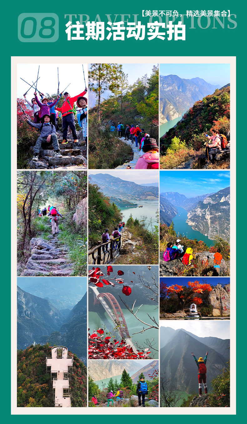 只要不是大暴雨,行程都是可以正常走,我们会准备一次性雨衣,有户外雨衣的话可以自备。秋雨蒙蒙的时候,巫峡上空云雾翻腾,十分壮观,“除却巫山不是云”。并且有三段徒步可以选择半程或者游玩景区。