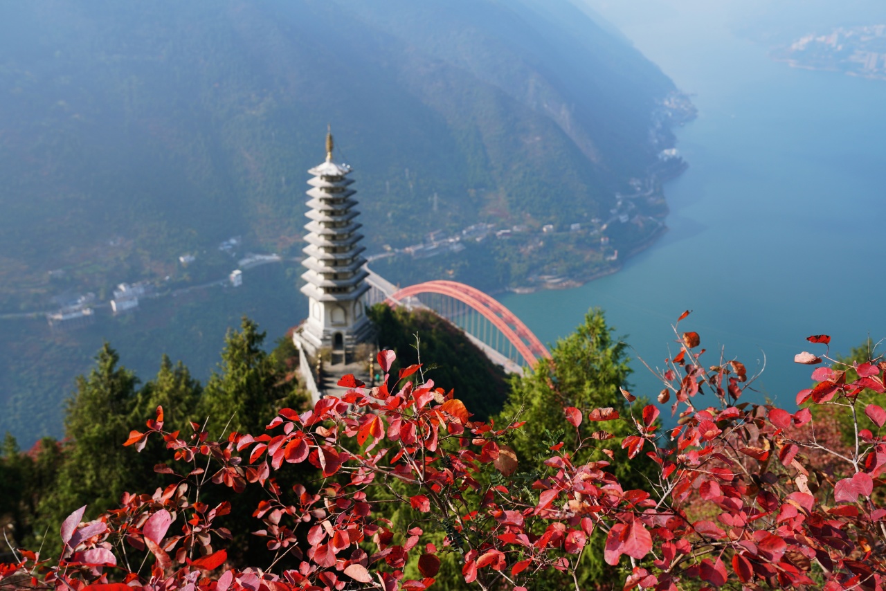 三峡之巅风景区,因杜甫“赤甲白盐俱刺天,闾阎缭绕接山巅。枫林橘树丹青合,复道重楼锦绣悬”的诗句而得名,是长江三峡物理形态的最高处,景观形态的最美处。站在三峡之巅俯瞰长江的壮美和那满山的红叶。时间碰巧的话,在三峡之巅还有个人的音律表演。