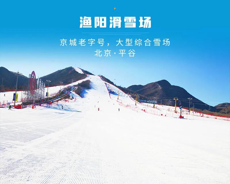 渔阳国际滑雪场位于北京市平谷区东高村镇大旺务村,占地6000余亩,是集雪上运动、生态园餐厅、住宿、拓展训练、会议、休闲、采摘于一体的综合滑雪旅游胜地。雪场已建成1600米的高级道2条,700米的中级道3条,600米的初级道2条,300米的教学道1条,配有惊险刺激的雪圈道2条、雪地摩托道1条,单板公园1个,儿童乐园1个,并配备了4人缆车1条,双人座椅缆车1条,大小拖牵6条,魔毯3条,雪道运力能够满足高、中、初级不同滑雪水平人群的选择。